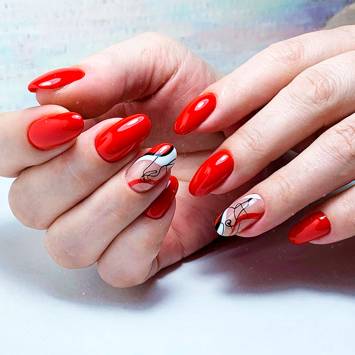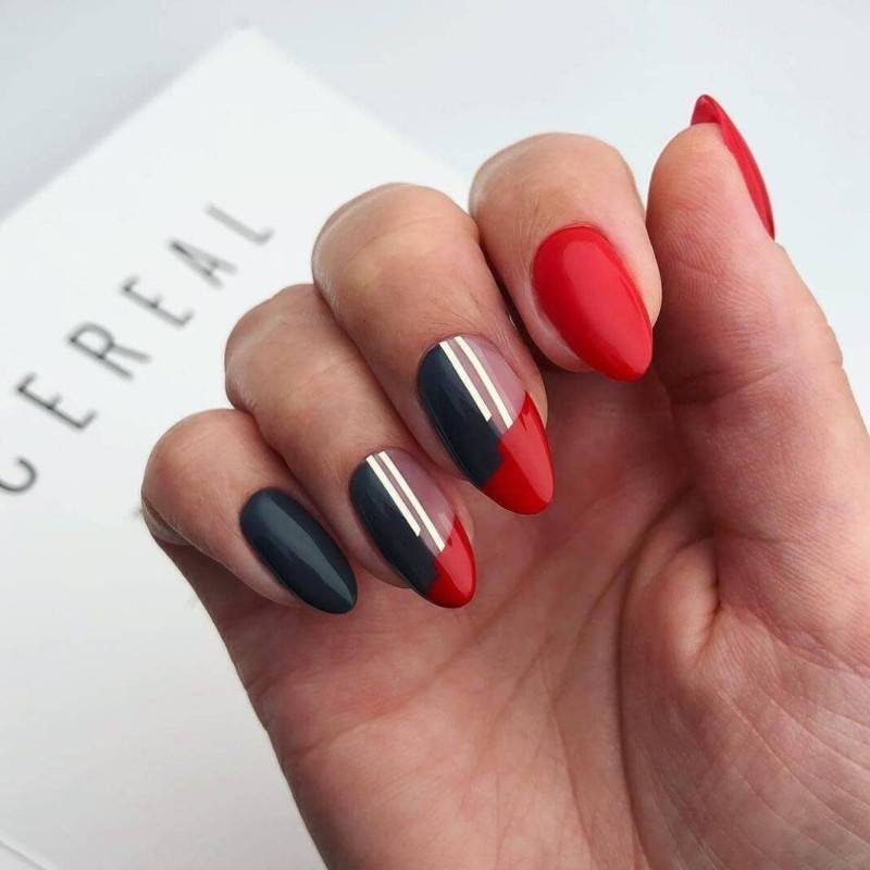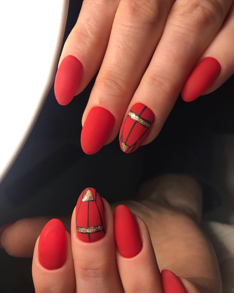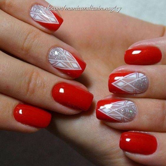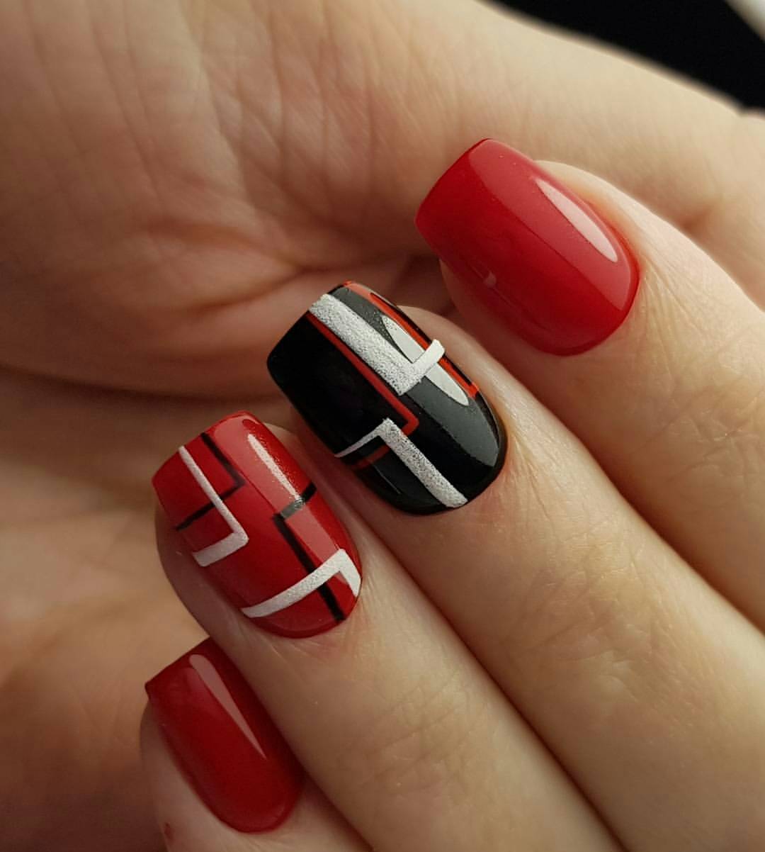 Один из самых горячих трендов в дизайне маникюра можно смело использовать с красным цветом. Сегодня в моде геометрический нейл-арт в любом проявлении: начиная от лаконичных линий и паутинок заканчивая сложными объемными конструкциями. Если хочется чего-то простого, всегда можно ограничиться лаконичной клеткой или узором из ромбов. А еще, всегда актуальны абстракции, так что смотри следующий блок, чтобы почерпнуть идеи для сочетания других цветов цветов с красным.