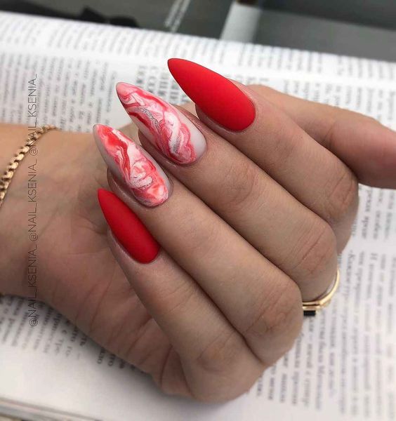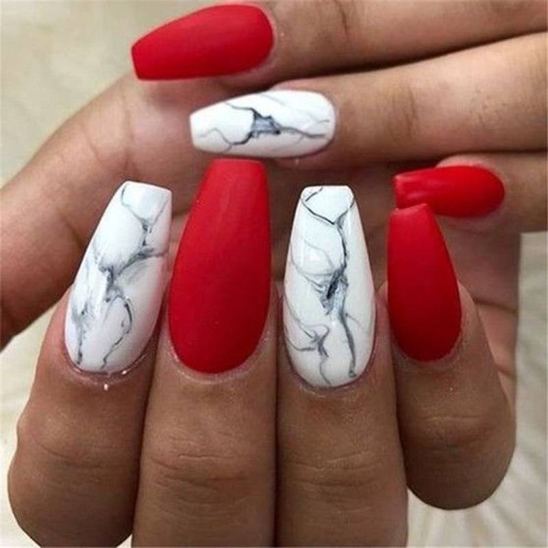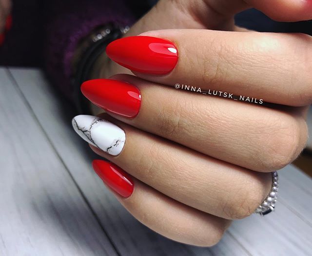 Среди классических решений внимания достойно и красно-черное сочетание. Оно смотрится особенно выигрышно, дерзко. Поэтому его используют в оформлении ногтей достаточно часто. Только представьте, насколько роскошно будет смотреться в таком сочетании френч или геометрический дизайн. Что касается мраморного рисунка, то в таком случае красный цвет выполняет роль основы, а тонкие линии должны быть черными. Наносить их лучше всего специальной кистью. Впрочем в домашних условиях для этого нередко используют простую зубочистку. Конечно же, все это требует практики и только со временем получится создавать удивительной красоты дизайн даже в домашних условиях.