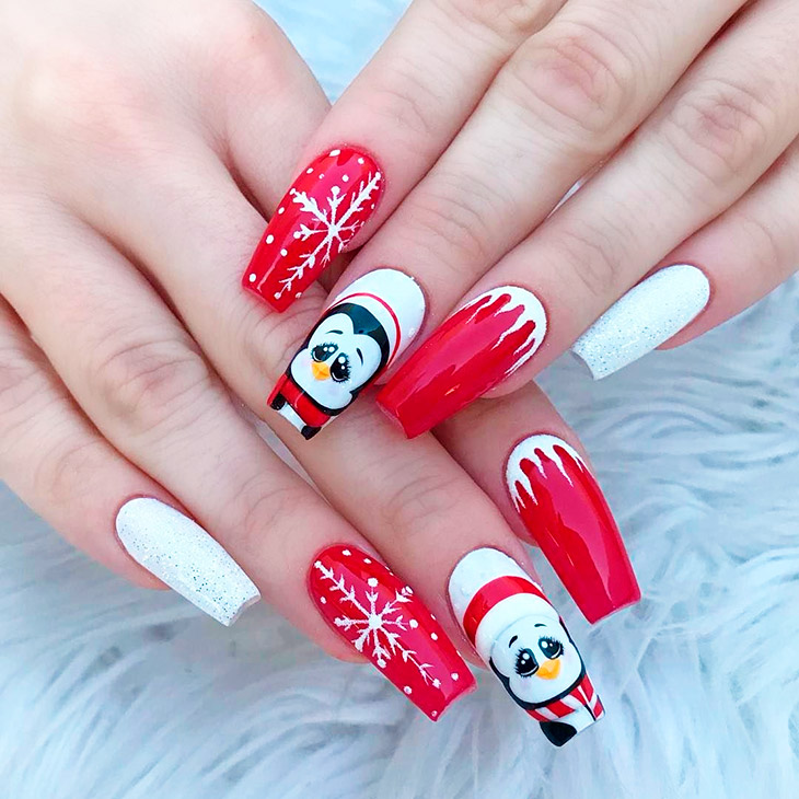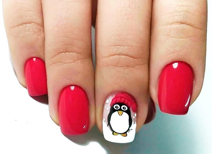 Не надо заблуждаться насчет пингвинов в красном дизайне – это не исключительно детский вариант. В качестве праздничного разнообразия, пингвин может украсить ногти женщина среднего возраста и статуса. Обычно это наклейки или качественные рисунки вручную. Делают их строго на светлом акцентном ноготке.