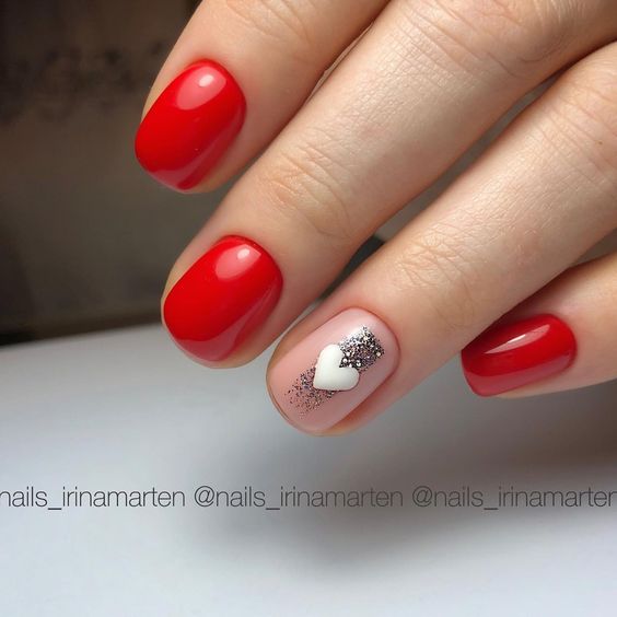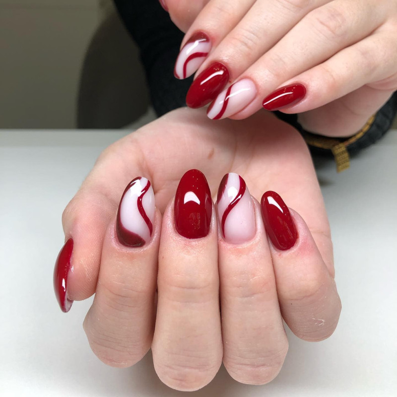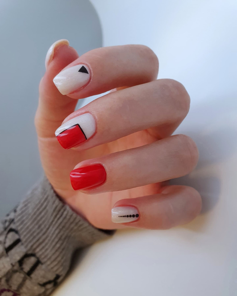 Если вы хотите разбавить красный цвет, чтобы он не смотрелся слишком агрессивно и страстно, остановите выбор на белом лаке. Этот тандем очень гармонично смотрится на ногтях.