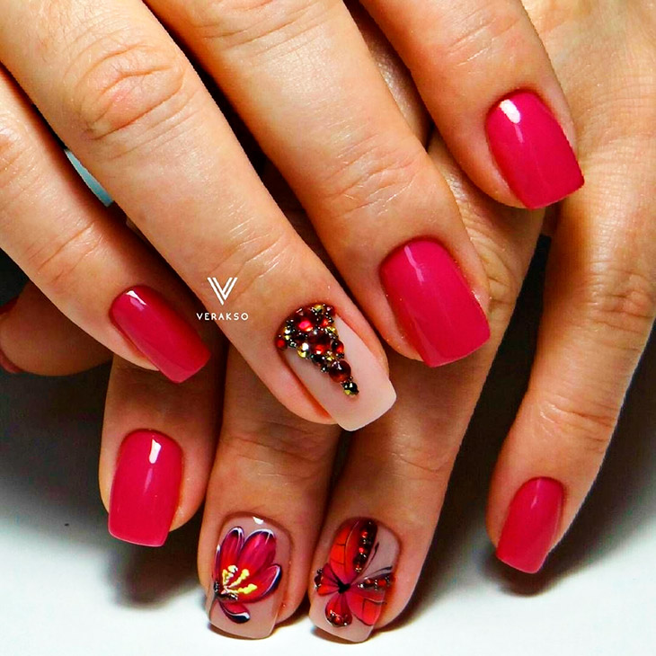 Достаточно лишь немного фантазии и желания. А также можно использовать различные оттенки красного. Например, для этого отлично подойдет маникюр, выполненный в цвете фуксия.