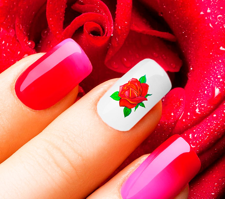 Наиболее востребованы для маникюра в красных тонах «переводилки», которые позволяют получить отличный вариант, сэкономив время мастера.