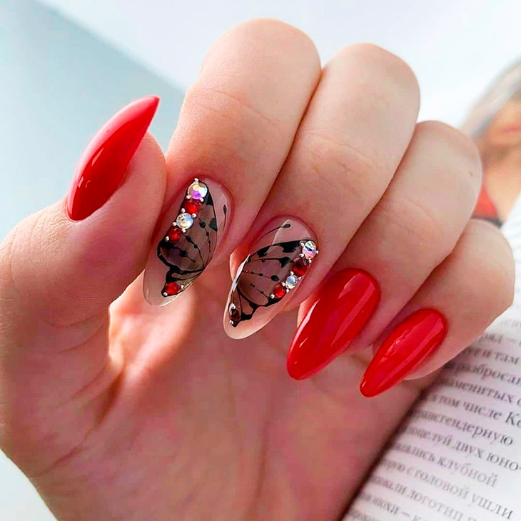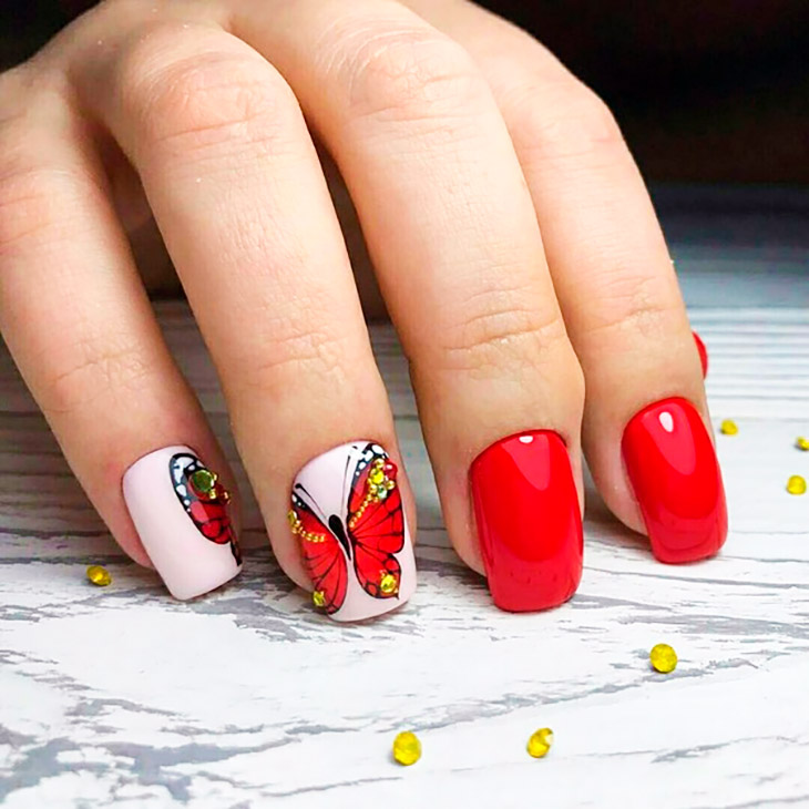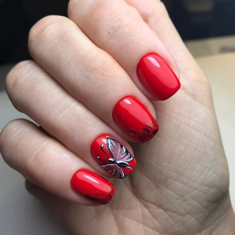 Невесомо парящие бабочки украсят любые ноготки. Когда речь заходит о красном маникюре, их рисуют тонкими черными линиями, придавая законченность блестками или стразами. Так же нарисовать красно-черную бабочку можно на светлом акцентном ноготке.