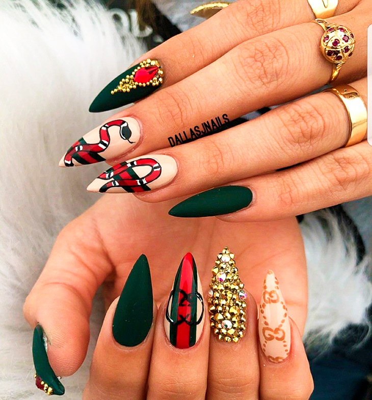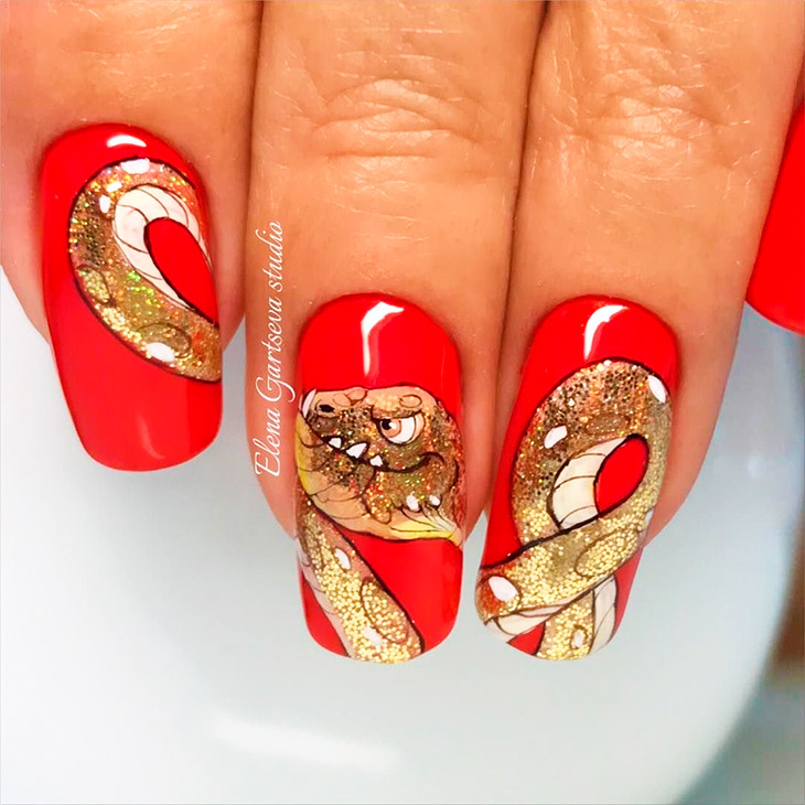 Серебристо-черная змея, обвивающая красный ноготь, – этот мотив в наступившем году будет часто встречаться в теме маникюра. Змея может быть с элементами зеленого и золотого.
