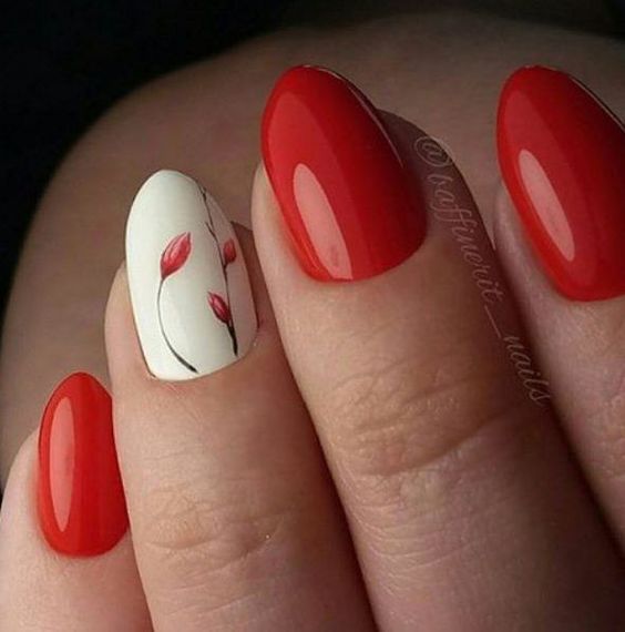 Рисунок веточки обычно находится сбоку ногтевой пластины, имеет небольшой размер и вытянутость по вертикали – для красного маникюра подходят золотое, черное и любое контрастное решение.