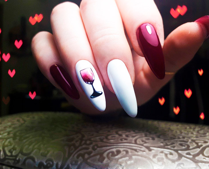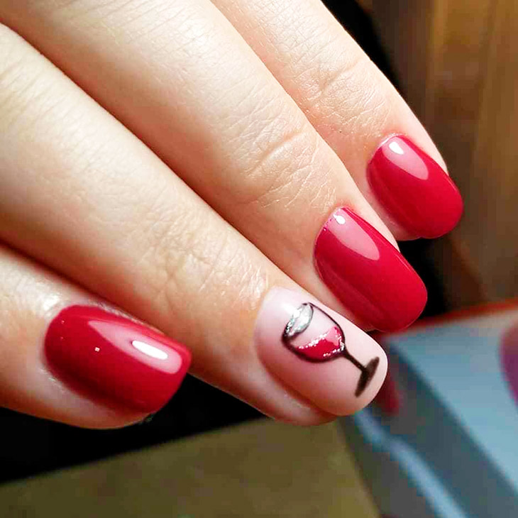 Праздничная тематика может быть реализована: на акцентном ногте рисуют бокал, полный красного вина – контур заполняют прозрачным гелем с глиттером. Блестки темно-красного, золотого или черного цветов создают эффект игристости напитка.