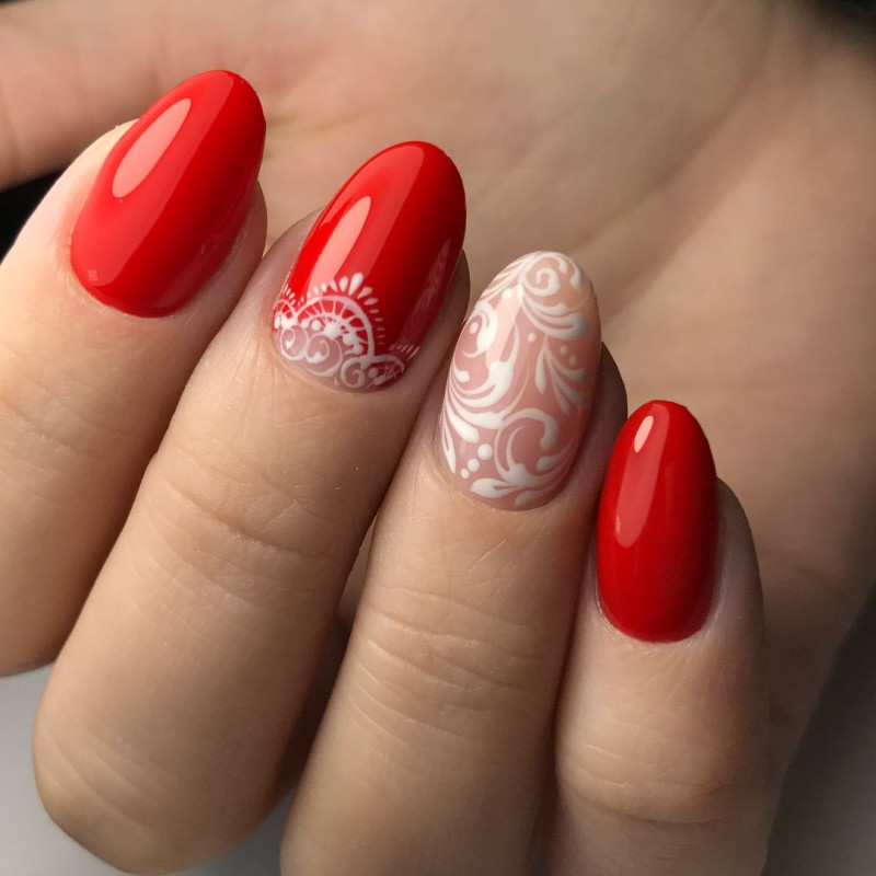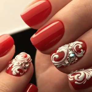 Белым можно сделать лишь несколько неброских акцентов, а иногда и выбрать его как фон для красивого рисунка. Нежным и утончённым маникюр сделают белоснежные вензеля на алом фоне.
