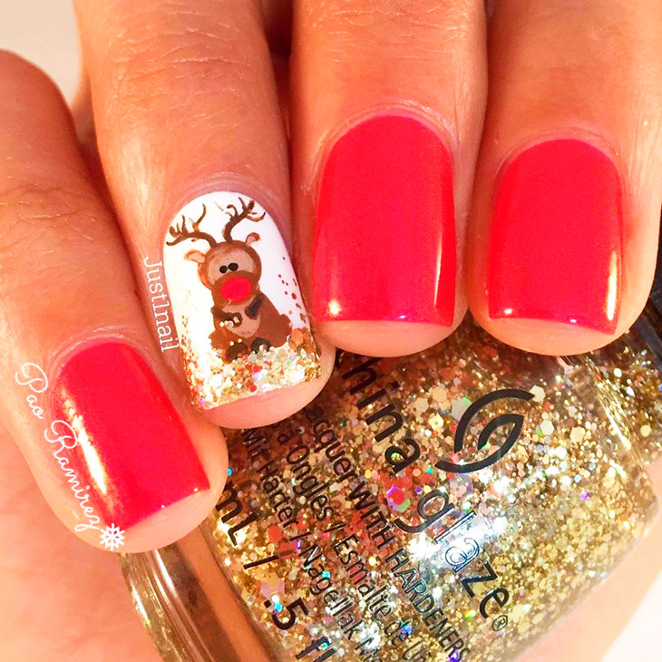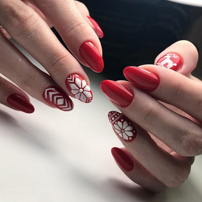 Рождественские красные мотивы с оленем могут украсить руки дам всех возрастов. А почему бы и нет – это смотрится так по-детски наивно и нежно, что позволяет ощутить себя на двадцать лет моложе. Дорогой дизайн лучше рисовать, чем использовать наклейки.