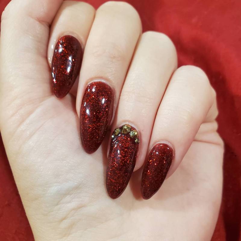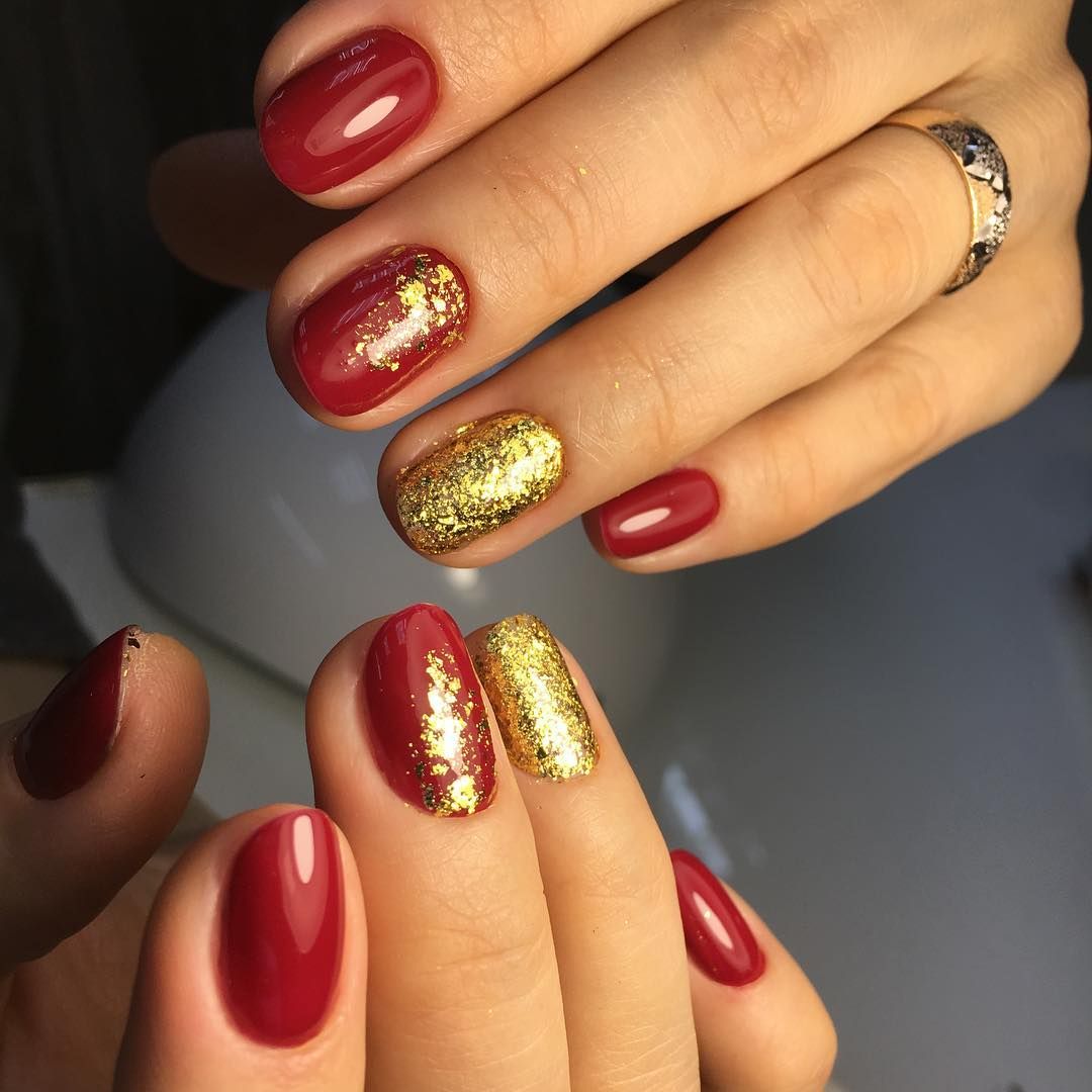 В качестве основы лучше подбирать более глубокие красные оттенки, поскольку за счет этого ногтевая пластина визуально удлиняется. В качестве декора лучше всего добавить геометрический рисунок из блестящих полосок, либо выложить стразы или бульонки по диагонали ногтевой пластины.