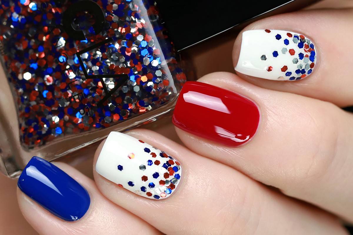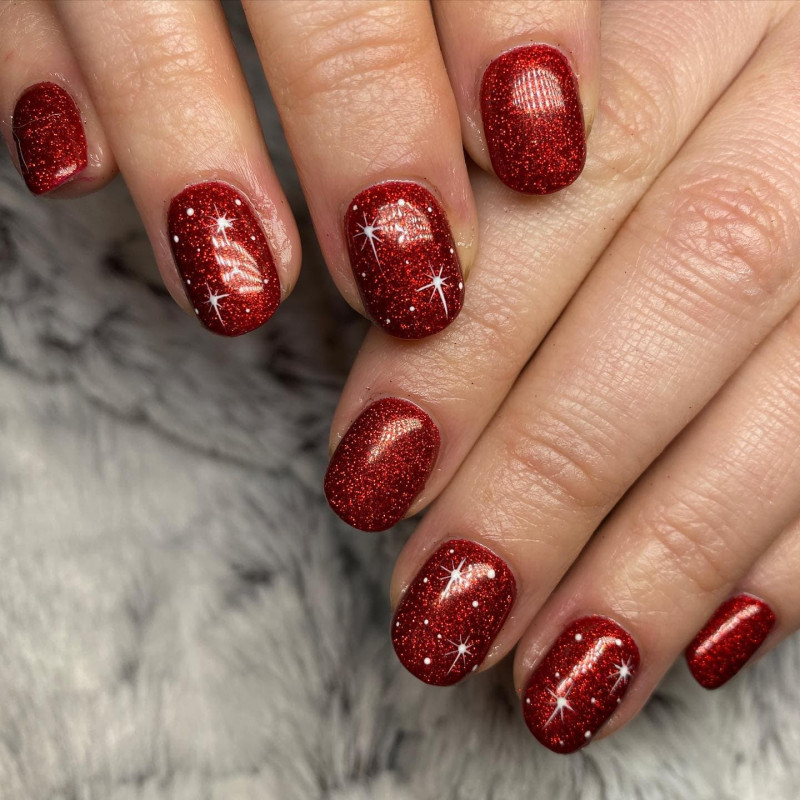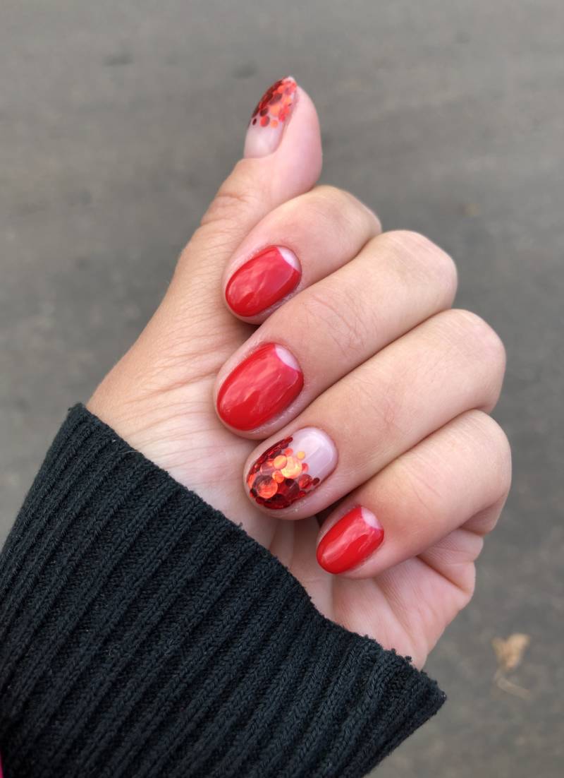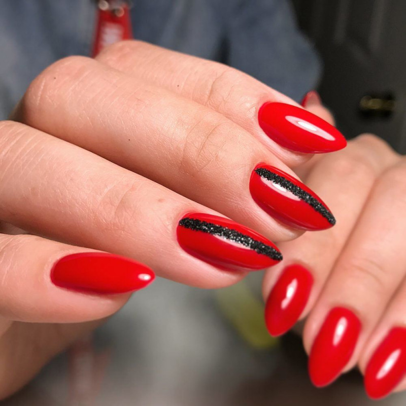 Россыпь холодных блесток привлекает внимание и разбавляет красный цвет. Рекомендуется выполнять в стиле геометрия с декором (скотч-лента, стразы)