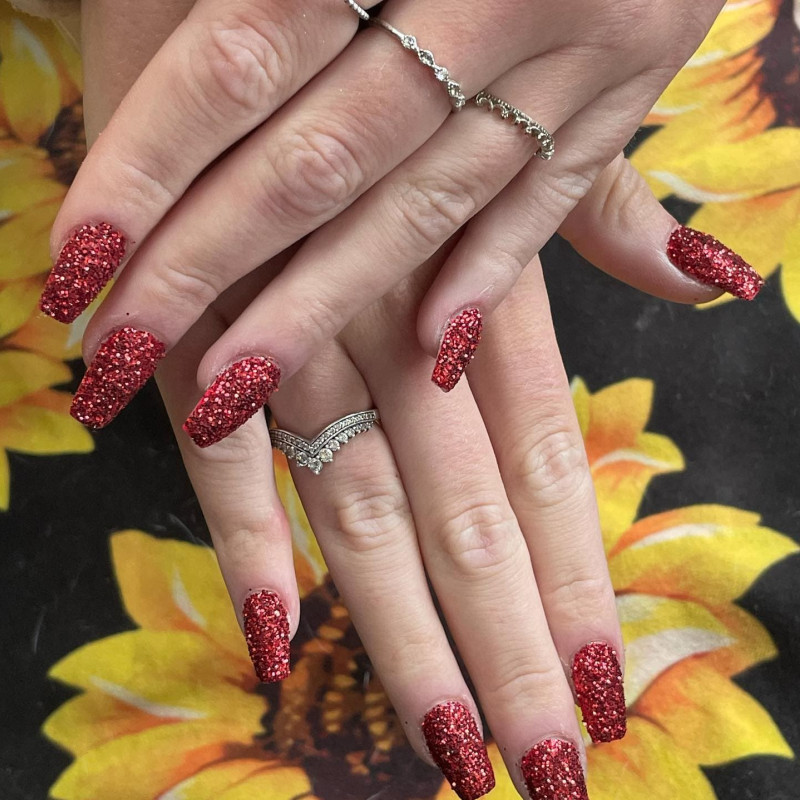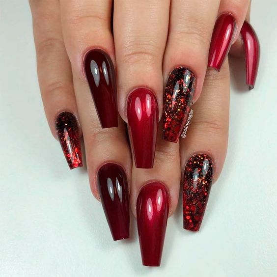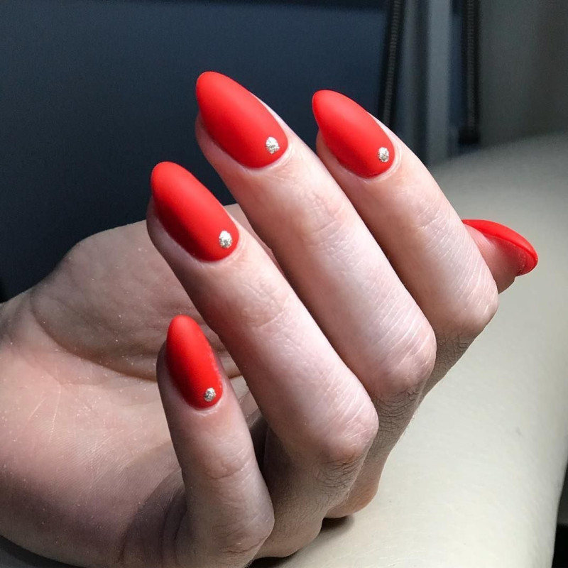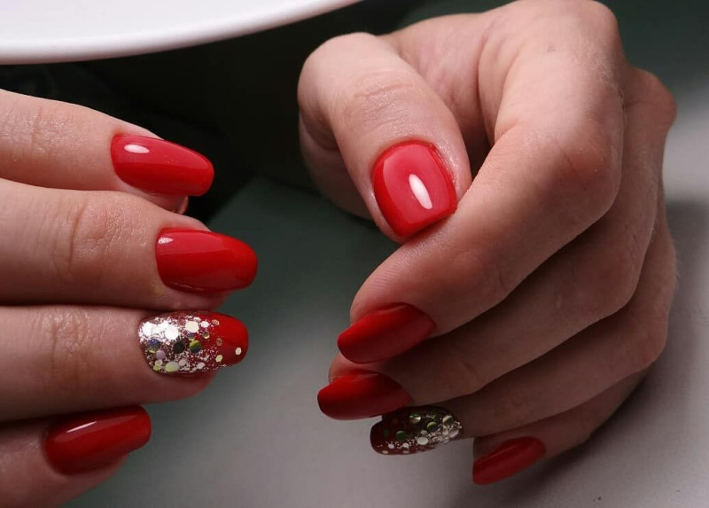 Если ты хочешь выжать максимальный градус шика из красного цвета, предлагаем тебе использовать блестки этого цвета. Опять же, здесь есть множество вариантов. Как минимум, ты всегда можешь сделать красный маникюр с деликатными стразами — их серебристый блеск будет отлично контрастировать с главным цветом. Ну а для более смелых девушек есть вариант с глиттером разного калибра, бархатным песком, создающим крутую шероховатую текстуру, или гель-лака с уже вмешанными в него мелкими блестками. Естественно, все это — красного цвета.