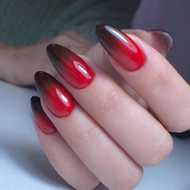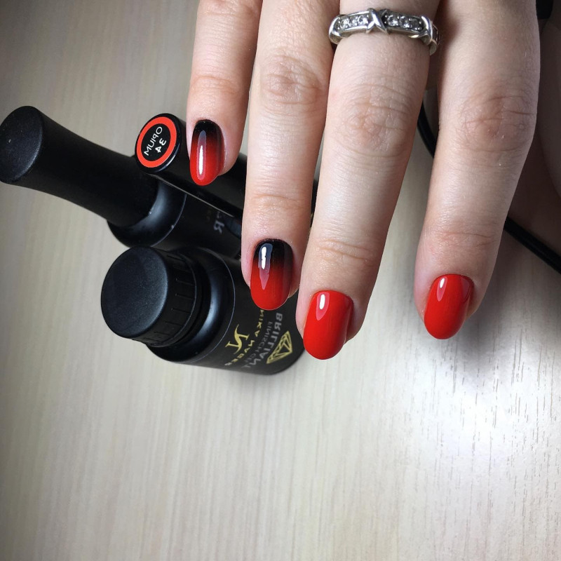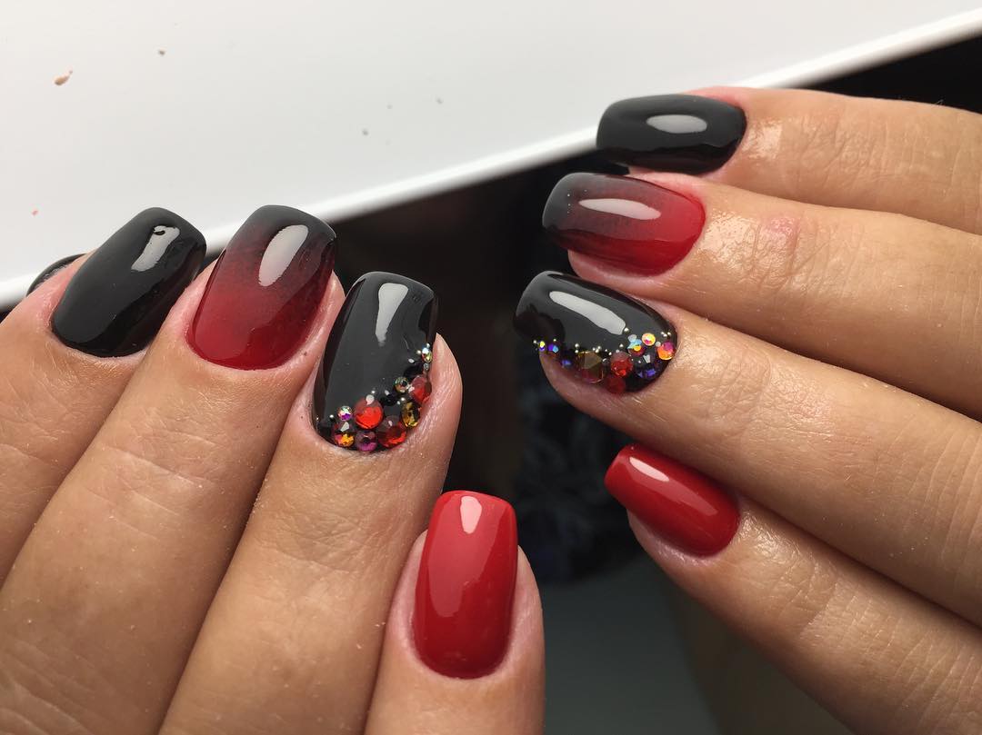 Также красный цвет нередко используют в качестве основы для градиентного дизайна. Плавный переход оттенков от красного к черному тону – стильное решение для самых смелых модниц. Дополнительным украшением такого маникюра часто являются стразы, блестки или небольшое количество пигмента.