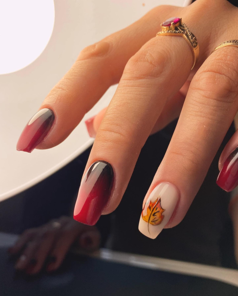 Листья клена в темно-красном, оранжевом исполнении, или выполненные черными тонкими линиями, хороши в осеннем дизайне. Техники нанесения: рисунок по трафарету, от руки или наклейка.