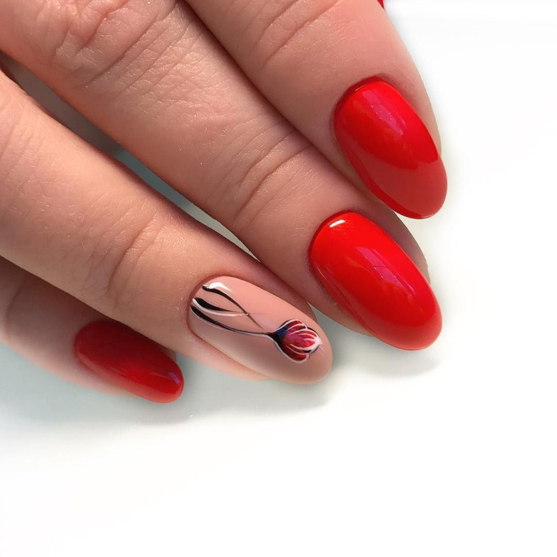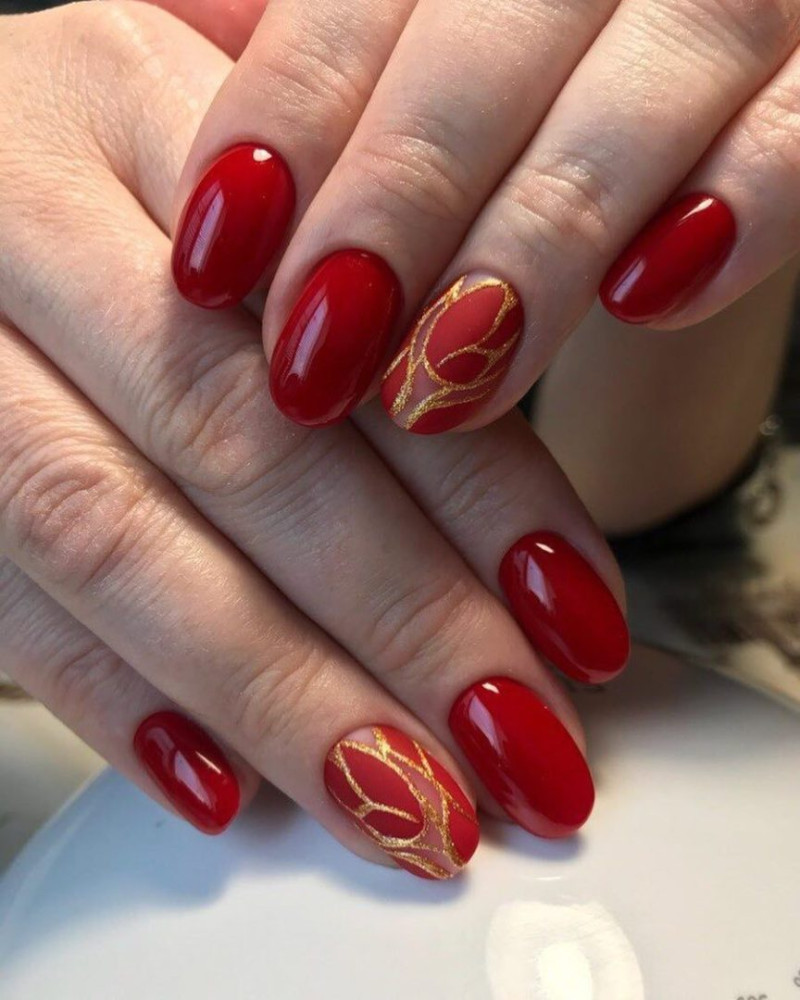 Основным фаворитом красного маникюра гель-лаком станет тематическая роспись нескольких ноготков в сочетании со скромными и сдержанными остальными ногтями.