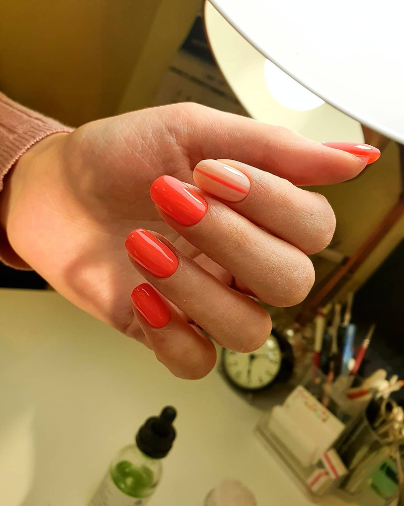 - Первый цвет берём в качестве основы — им будут выкрашены все ногти, акцент делаем лишь на безымянном и среднем.