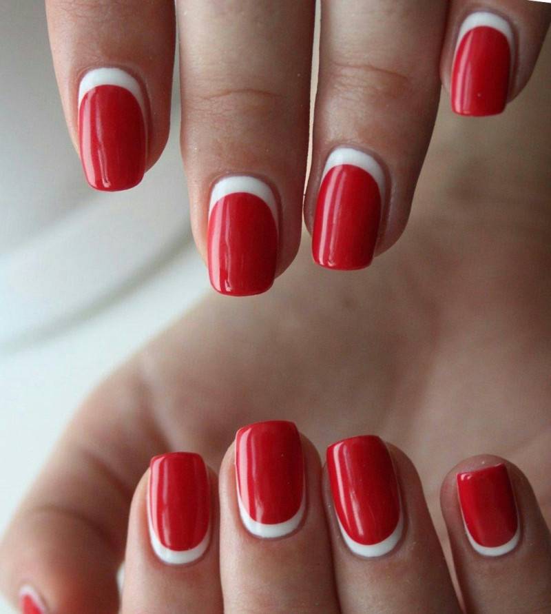 Сочетание техники классического френча и лунного маникюра в красно-белой гамме: