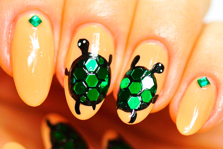 Рисунок с черепахой относится к морской тематике, он может выполняться на акцентном ногте в полном цвете и даже с блестками, красно – черным контуром.