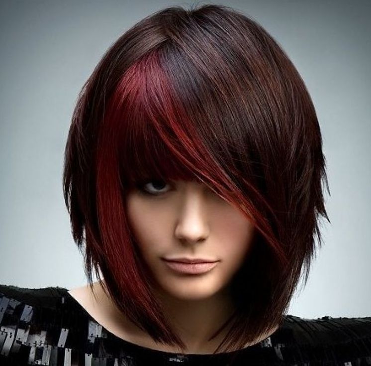 Шикарно смотрится с короткими стрижками, придает образу гармоничности, динамики. Помогает создать объем, благодаря ниспадающим прядкам разной длины. Отлично скрывает недостатки, делая красивую линию скул. Хороший вариант для круглолицых дам с редкими волосами. Подчеркнуть косую челку можно современным окрашиванием типа мелирования.