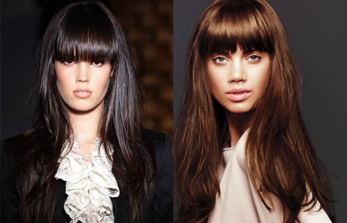 Густая прямая челка отлично сочетается с длинными прямыми локонами средней жесткости, а для очень жестких волос, чтобы визуально облегчить челочку, лучше подойдет «рваная» текстура стрижки.