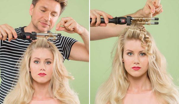 1. Делим волосы на тонкие прядки и каждую из них накручиваем на щипцы в форме вилки.
