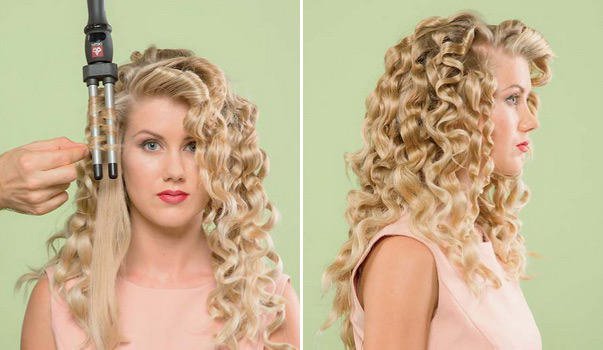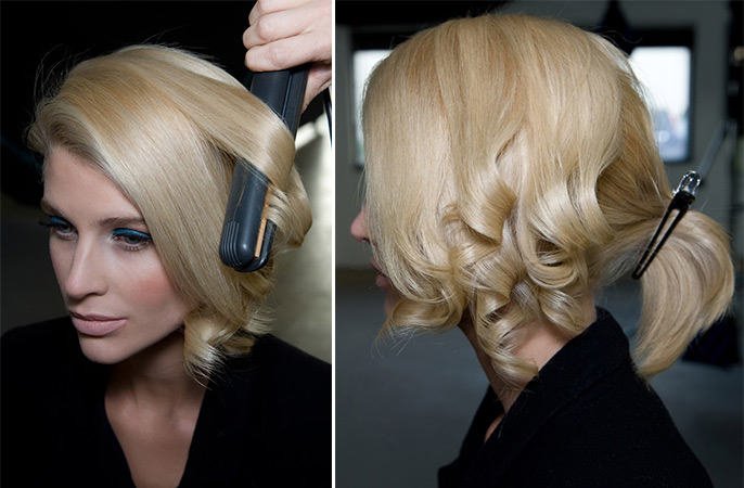 Шаг 4. Волосы, оставшиеся сбоку, делим на несколько секций. Накручиваем каждую из них плойкой или утюжком. Делаем это по направлению вниз, оттягивая плойку немного в сторону.