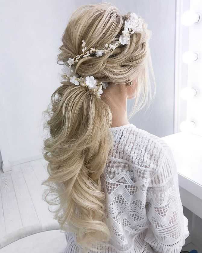 В тренде среди свадебных причесок – низкий хвост с крупными или мелкими локонами. С начесом или пробором – это уже на вкус невесты. Чаще всего выбирают низкий хвост набок, чтобы красивые локоны ложились наперед.