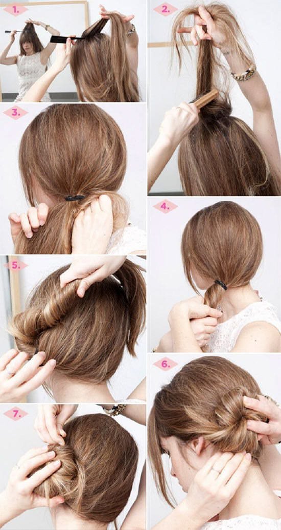 Шаг 5. Волосы сзади связываем резинкой и скручиваем в пучок. Закрепляем его шпильками.