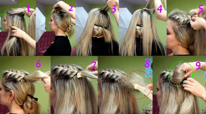- После подготовки волос заплетите косы на макушке простым французским колоском. Растяните пряди и закрутите резинкой.