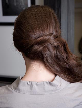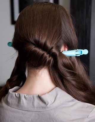 3. Нижнюю секцию сзади скручиваем вправо движением сверху вниз и закалываем невидимками. Теперь верхнюю часть скручиваем по направлению к этому жгуту и также закрепляем невидимками.