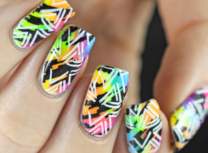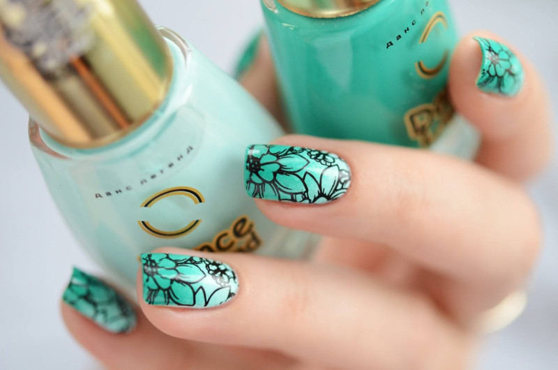 У каждого мастера свои предпочтения, какие лаки нужны для стемпинга, но черный и белый цвета всегда должны присутствовать. Они выгодно смотрятся на любых оттенках основного покрытия, а также они часто густые и насыщенные. Цветовые решения зависят от личных предпочтений. Разноцветные орнаменты выгодно смотрятся на черной или белой основе, а также на ярком покрытии. Используя краски либо лаки, можно создавать различные градиенты, которые хорошо переносятся на ногтевую пластину. На трафарет необходимо нанести несколько капель и выровнять их скребком, чтобы получились плавные переходы.