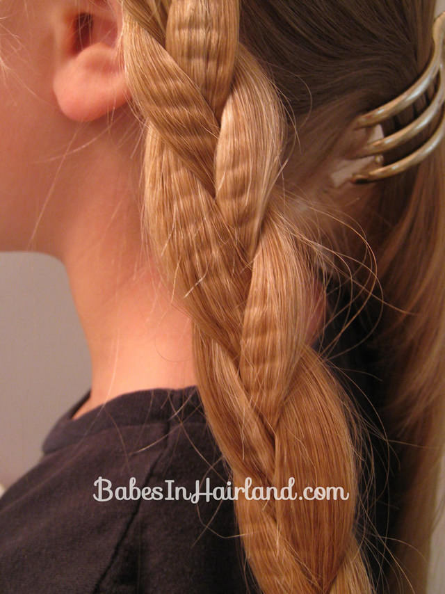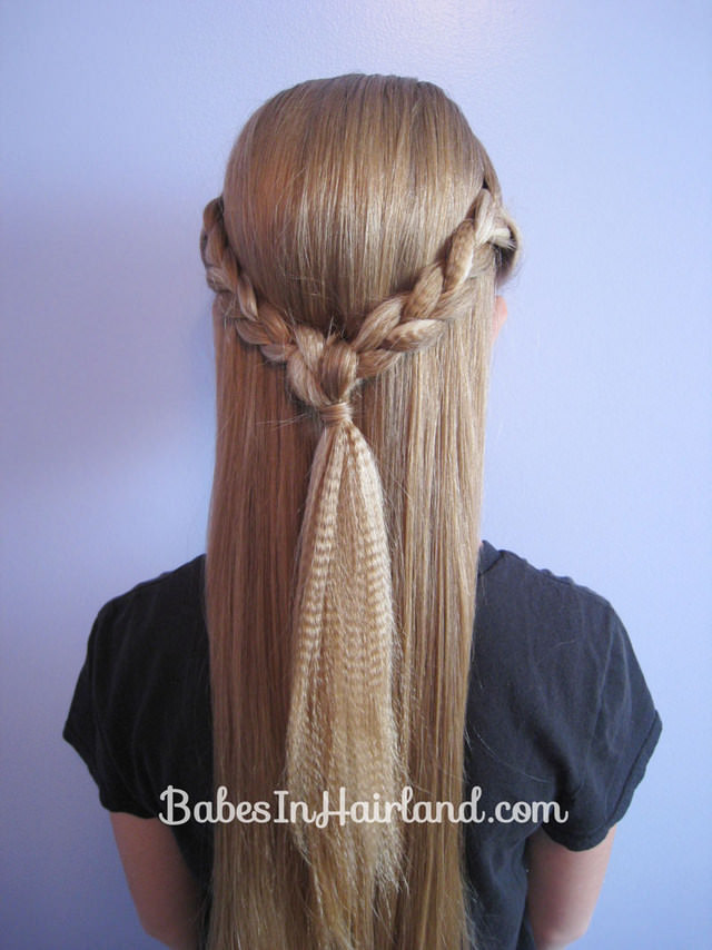 - Одну из боковых кос вденьте в противоположный затылочный хвост.
