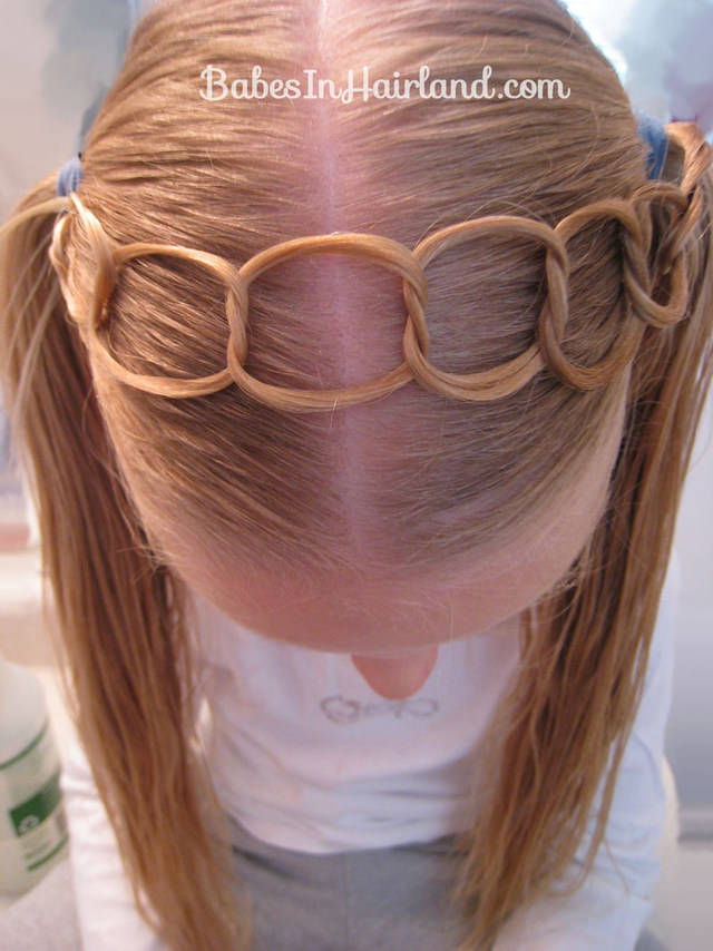 Такую же “цепочку” плетем от второго хвоста. После этого собираем свободные волосы в спиральные жгуты и слегка растягиваем “улитки” в стороны. Хвостики закрепляются внутри при помощи заколок.