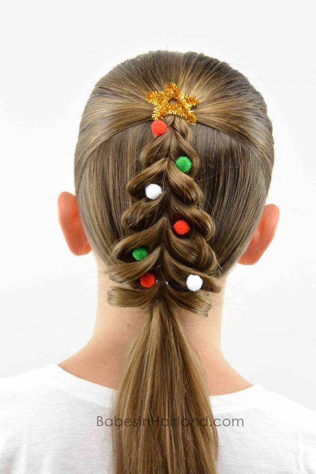 Если вы имеете дело с волосами средней и большой длины, вы можете также сделать красивые прически на Новый год для девочек на основе хвостиков, зафиксировав их переплетение заколками.