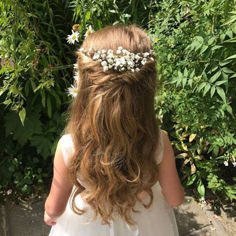 Младшей сестренке невесты подойдут легкие локоны, задорные косы и хвостики, высокие пучки. Если сестра будет нести кольца на церемонии, позаботьтесь о цветочном веночке на голову в тон основной флористике.