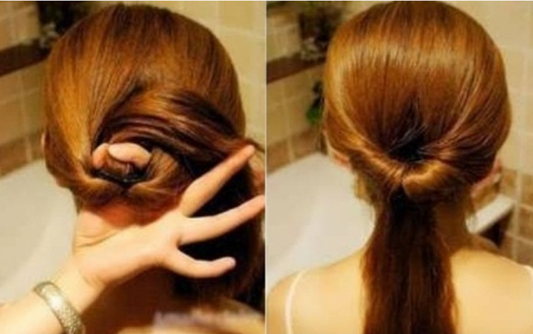 Хвост-наоборот. Завяжите обычный хвост — не тугой. У основания разделяем его пополам и в образовавшееся отверстие просовываем нижнюю часть хвоста. В принципе так и можно оставить, а можно сформировать нижний пучок еще раз завернув конец хвоста к основанию и украсив какой-нибудь заколкой или просто зафиксировав шпильками.