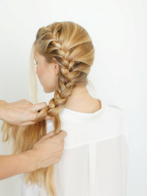 Шикарная коса-водопад идеально подойдет для праздничной прически. Для начала сделайте прямой пробор у лба и возьмите одну прядь волос у виска, разделите ее на три прядки. Начинайте плетение и после каждого нового узелка заменяйте верхнюю прядь локоном из основных волос. Завершите плетение у противоположного виска, закрепите хвостик невидимкой.