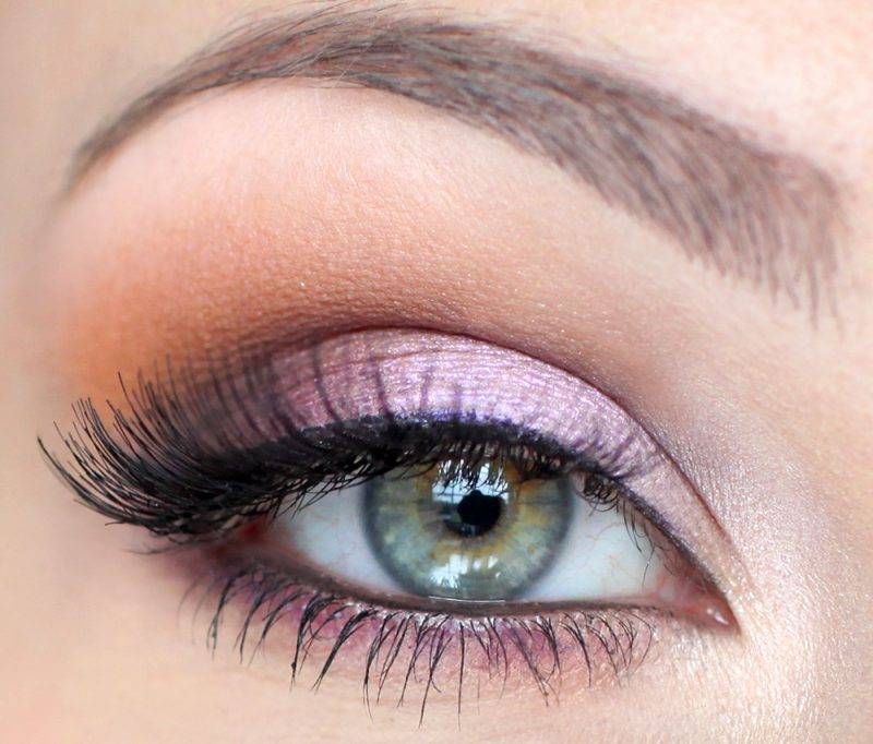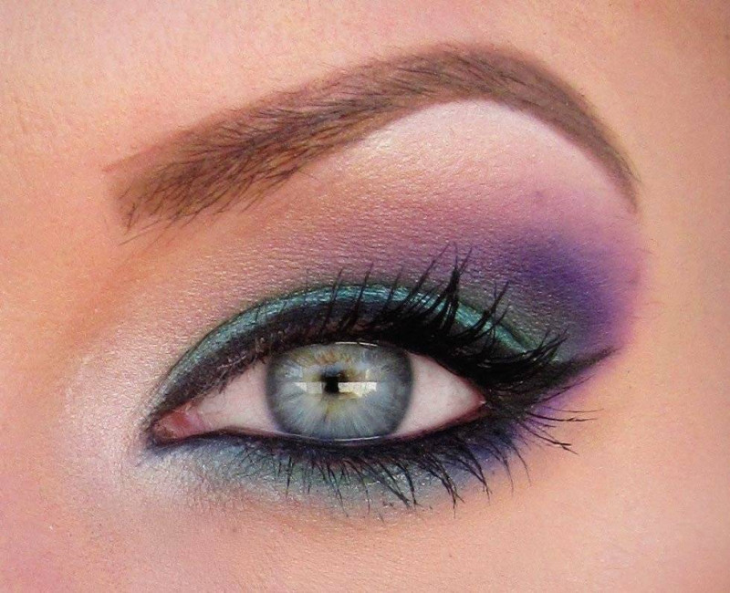 Вначале нужно выбрать два-три оттенка теней, которые хорошо растушевываются, дают красивый градиент и подходят к вашему лицу. Лучше всего выбирать два близко-родлственных цвета и один контрастный — например, два фиолетовых оттенка (потемнее и посветлее чтоб нарисовать дымку вокруг ока), и персиковый, чтоб подчеркнуть глубину взгляда.