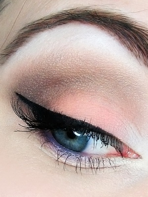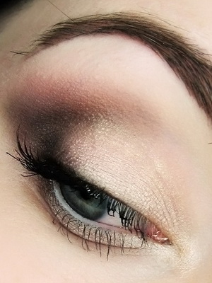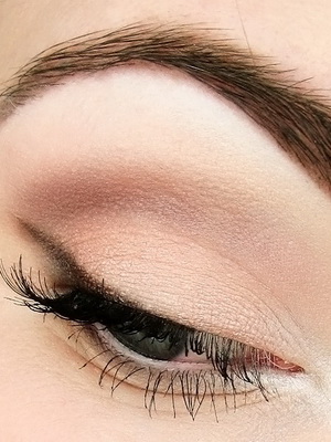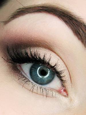6. Растушевать светло-бежевые тени от внутреннего уголка по верхнему веку до его середины. Нанести на ресницы тушь коричневых оттенков.