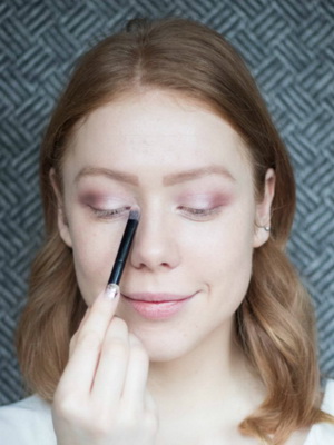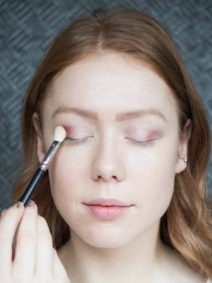 2. Растушевать тени мягкой кистью. В складку верхнего века и немного выше неё нанести розовато-персиковый тон, хорошо растушевать границу.