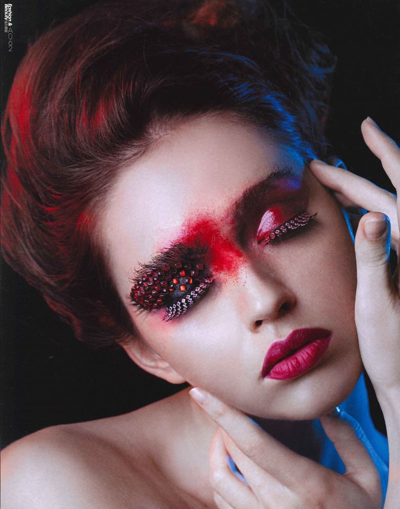 В выборе туши для ресниц можно использовать и черную, и такую же, как волосы. Стоит отметить что второй вариант будет более эффектным. Брови должны в точности повторять цвет волос. Губы покрываем рубиновыми или вишневыми пигментами