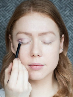 1. Мягкой плоской кистью нанести на веки основу. Покрыть верхнее веко бежево-коричневым тоном.