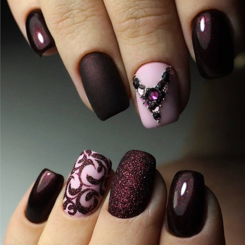 Стразы и блестки отменно впишутся в вечерний дизайн ногтей, особенно, если есть «поддержка» в виде красивого макияжа, да еще и с блестящими элементами. Популярным вариантом дизайна, который используется для новогоднего маникюра, вечернего, праздничного – это космический нейл-арт. Также в тренде использовать темные оттенки с блестками разных цветов, объединение блесток и страз в одном дизайне.