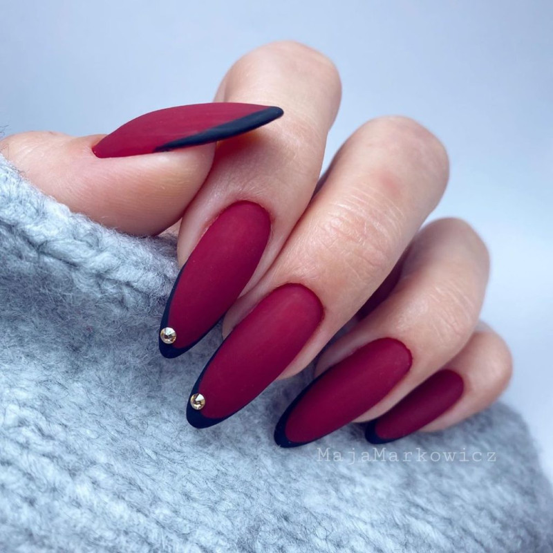 Популярен в 2023 году в виде минимализма. Бордовый, винный и вишневый актуален с длинными и короткими ногтями.