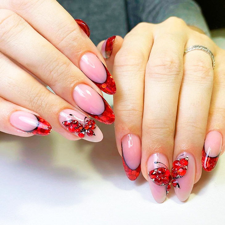 Бабочки у большинства девушек ассоциируются с летом и весной. Бабочки делают со стразами или бульонками, выделяют жидкими камнями.