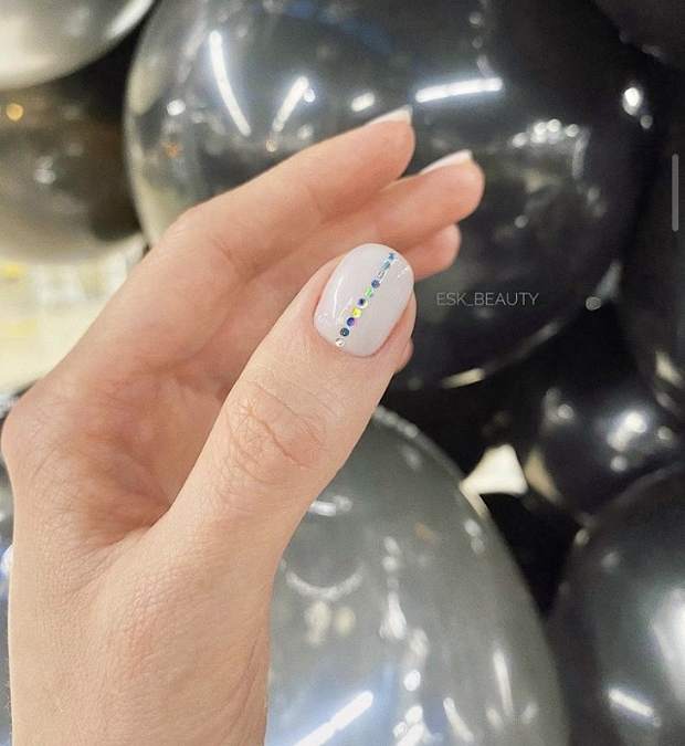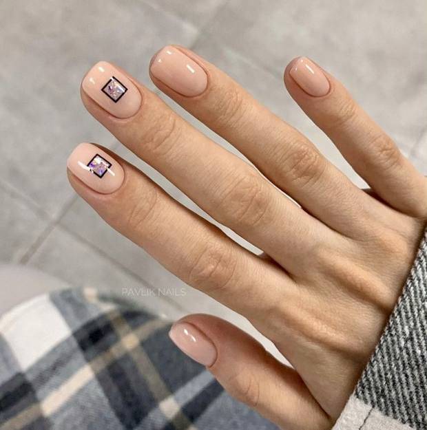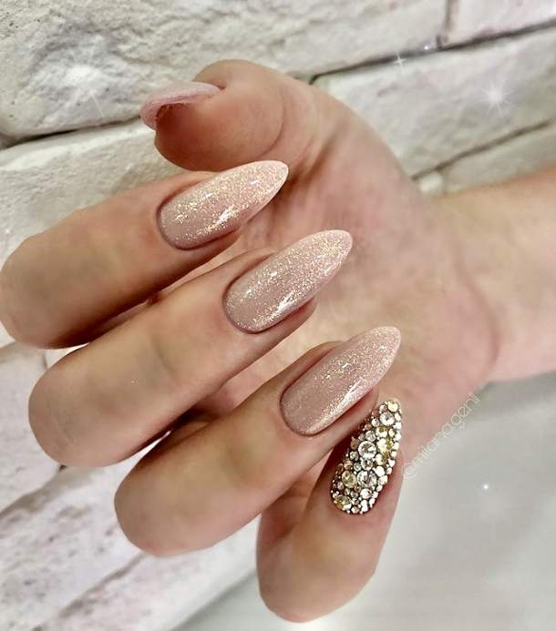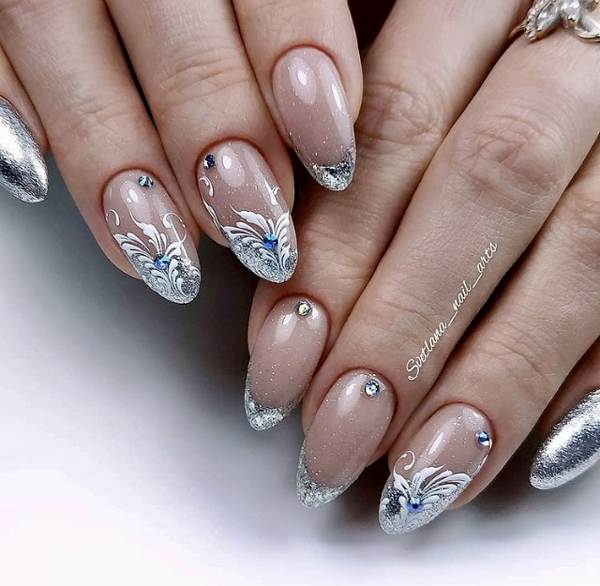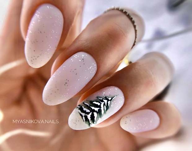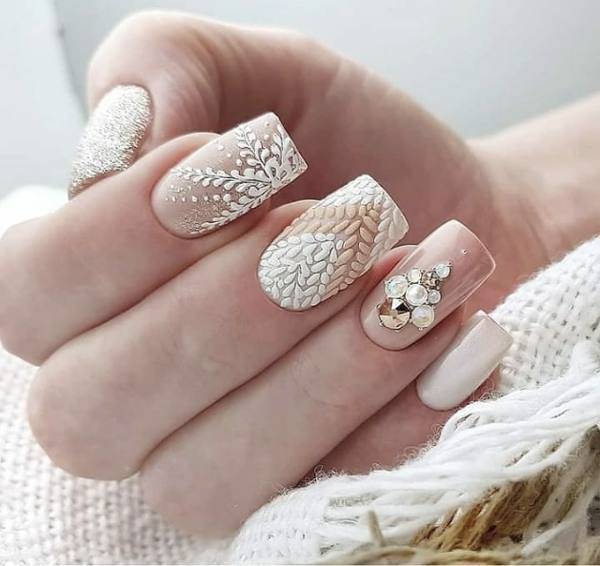 Также, очень празднично и нежно будут смотреться нюдовые ноготки с блестками и рисунками.