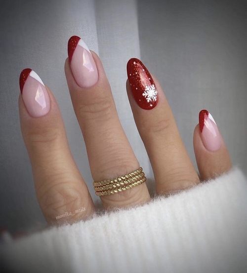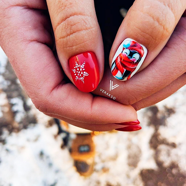 Не забываем и о рисунках для зимнего маникюра 2022-2023. Снежинки, снеговички, мандаринки, олени и мультяшные герои любимых новогодних фильмов – все с чем ассоциируется зима можно изобразить на ногтях, тем самым дополнив тот же френч и однотонный зимний маникюр.