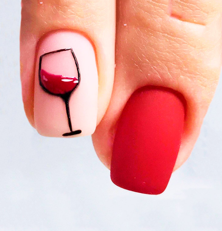 Популярен в 2023 году в виде минимализма. Бордовый, винный и вишневый актуален с длинными и короткими ногтями.