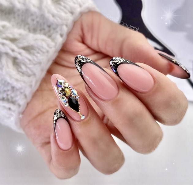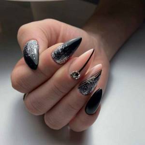 Стильно и эффектно будут смотреться длинные миндалевидные ноготки черного цвета, украшенные серебристыми блестками.