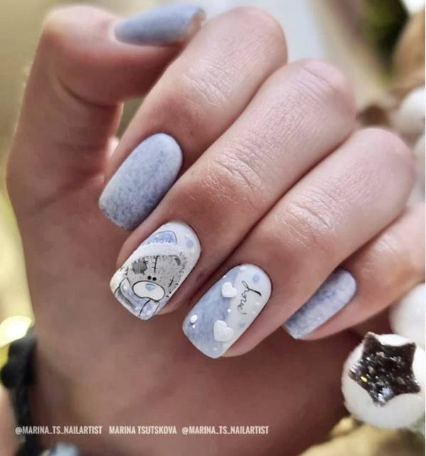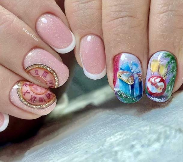 Очень популярны в Новогоднем дизайне этого сезона рисунки оленей, символа 2022 года — тигра, часиков, бокалов с шампанским, белых медведей и медвежат Тедди. Получается очень мило и необычно.