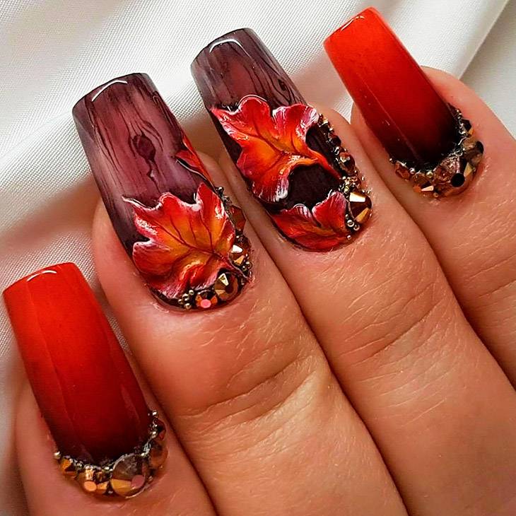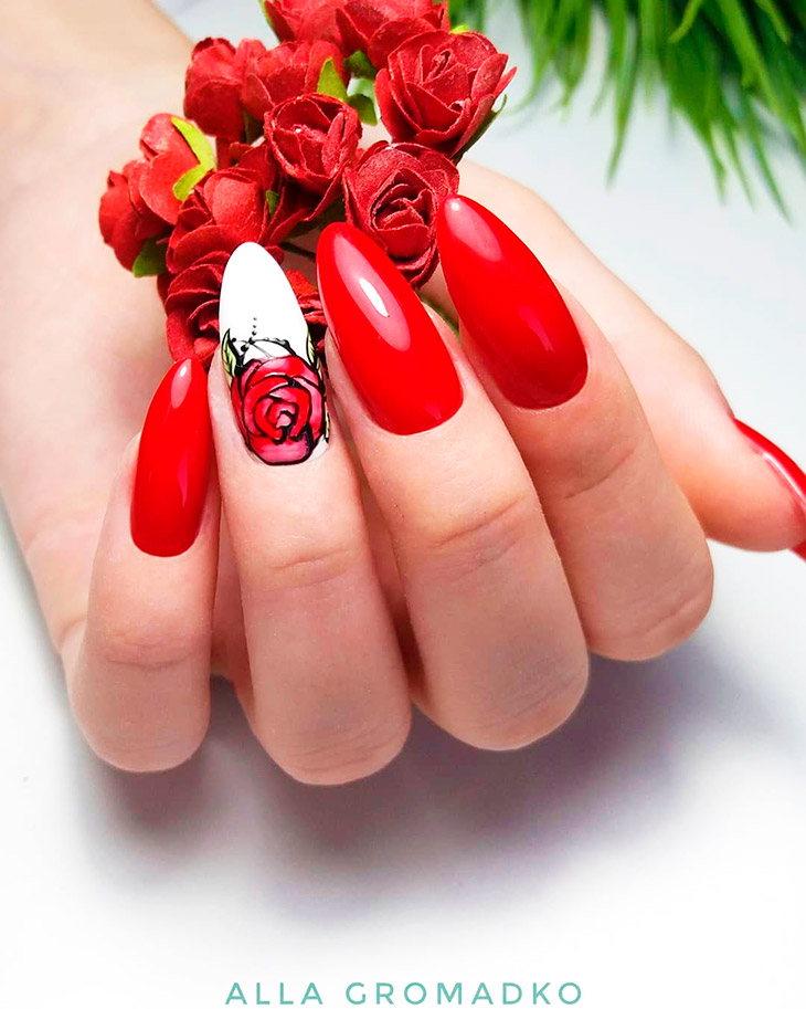 Вторым по-популярности, в этом сезоне является красный маникюр с различными рисунками. Это самое востребованное и желанное сочетание — вне моды и времени. Как мы знаем, красные ноготки любит большая часть прекрасной половины человечества, и рисунки на ноготках предпочитает не меньшее их количество.